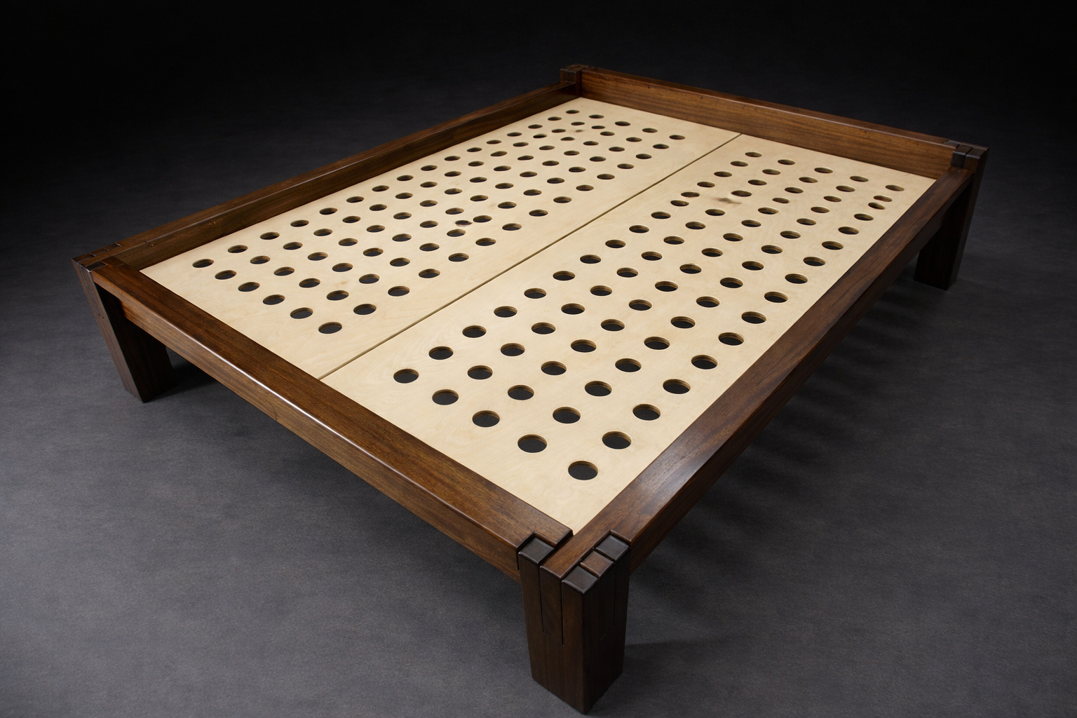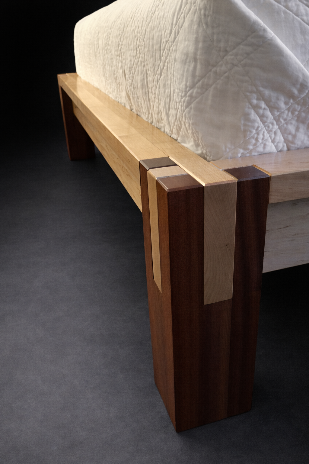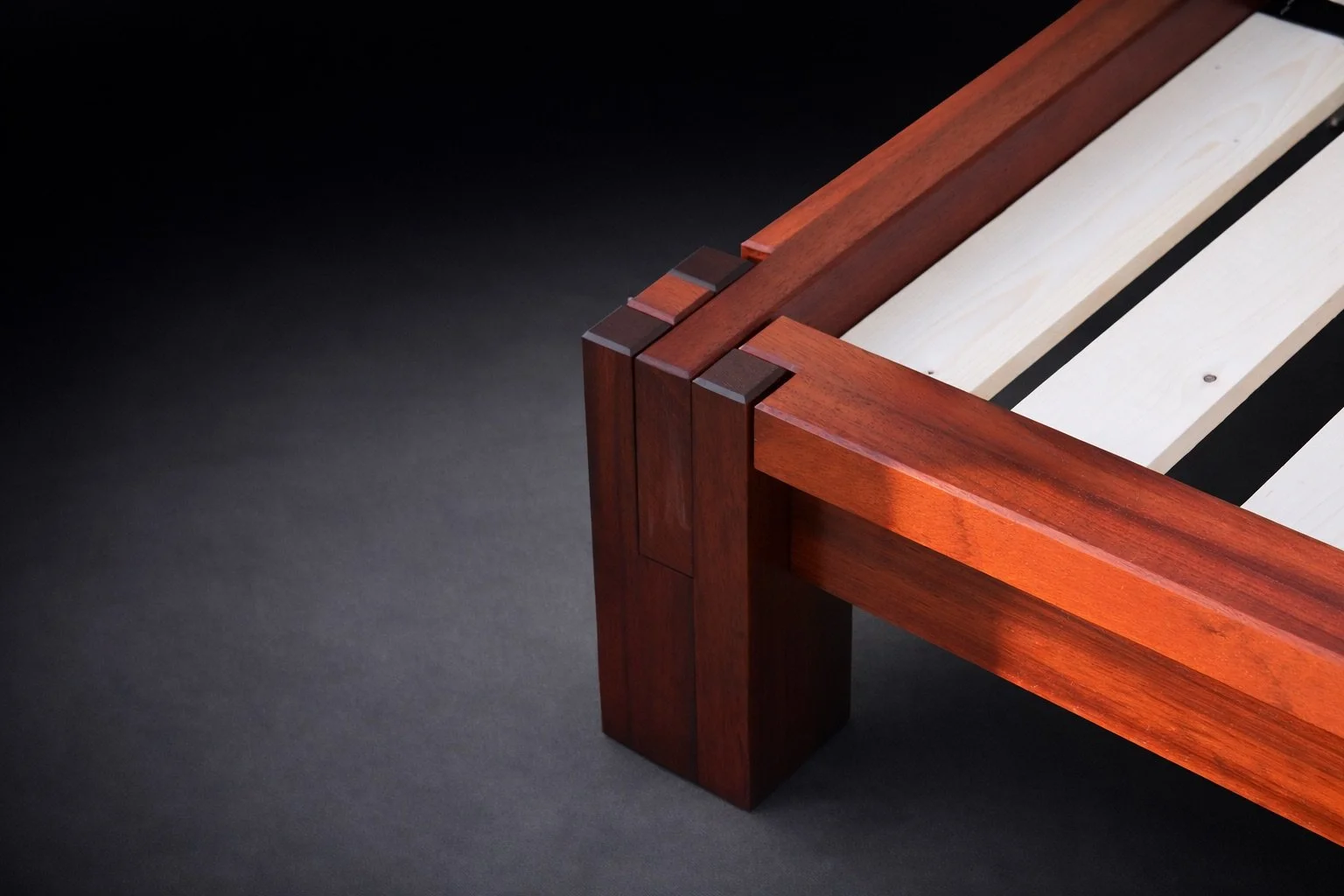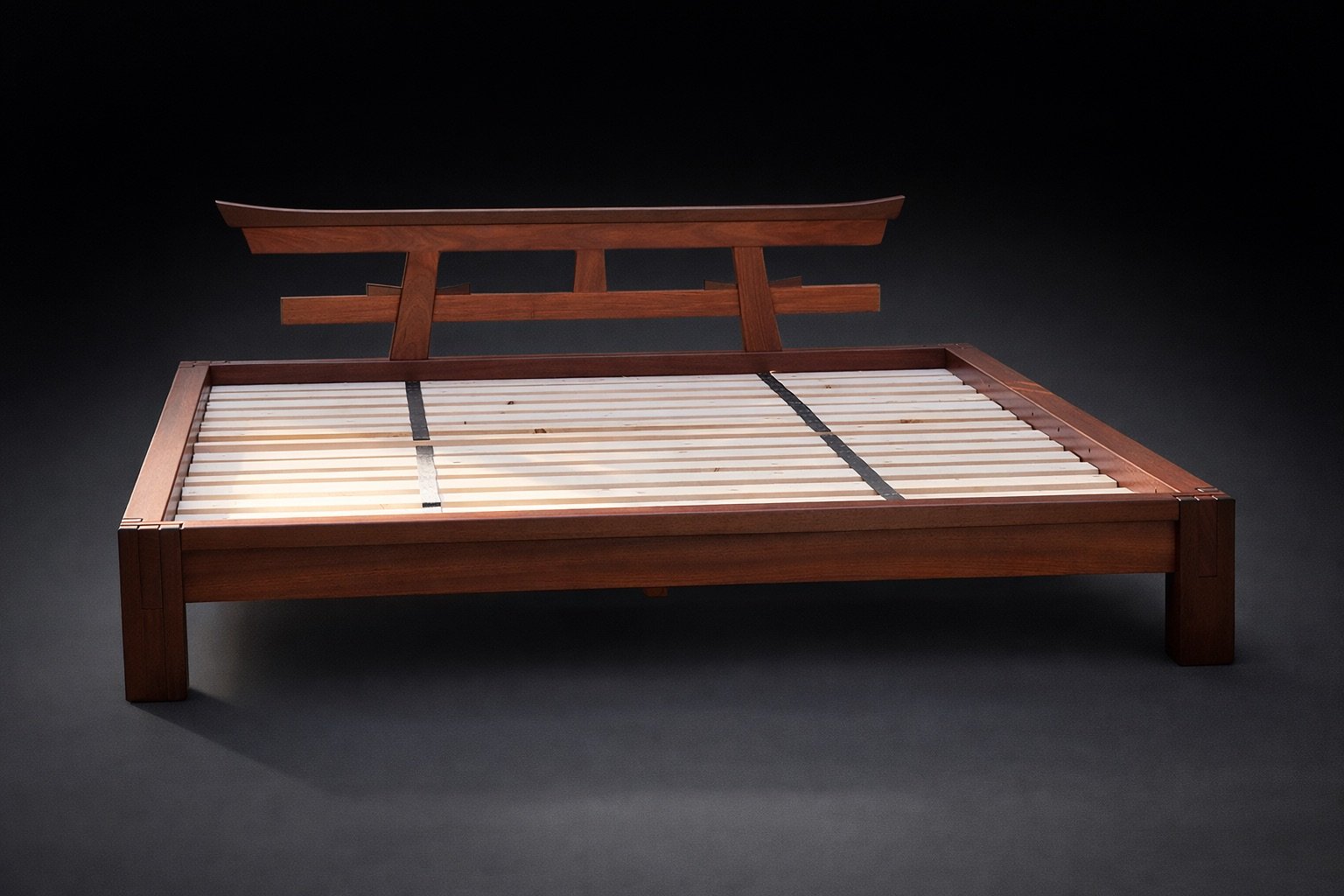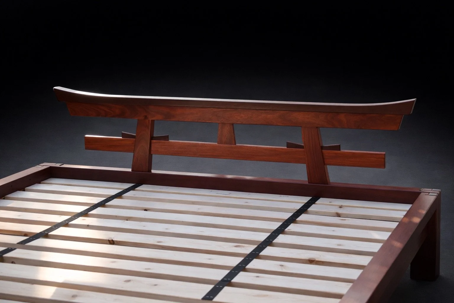 Constructed with Padauk lumber with Walnut legs. The headboard is fashioned after the Japanese Torri Gate.